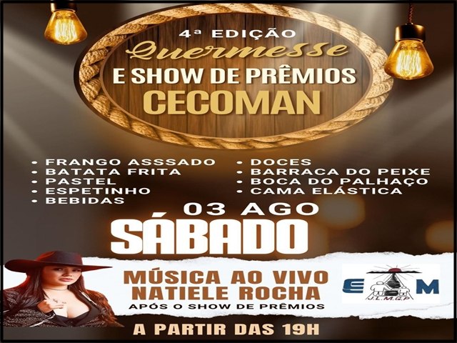 Cecoman, Trás Para Vocês a 4º edição e Quermesse Com Show de Prêmios O evento será realizado dia 03 de Agosto Vindouro em sua própria sede. Portanto, coloque sem sua agenda de lazer, convide parentes e amigos para prestigiarem este evento.